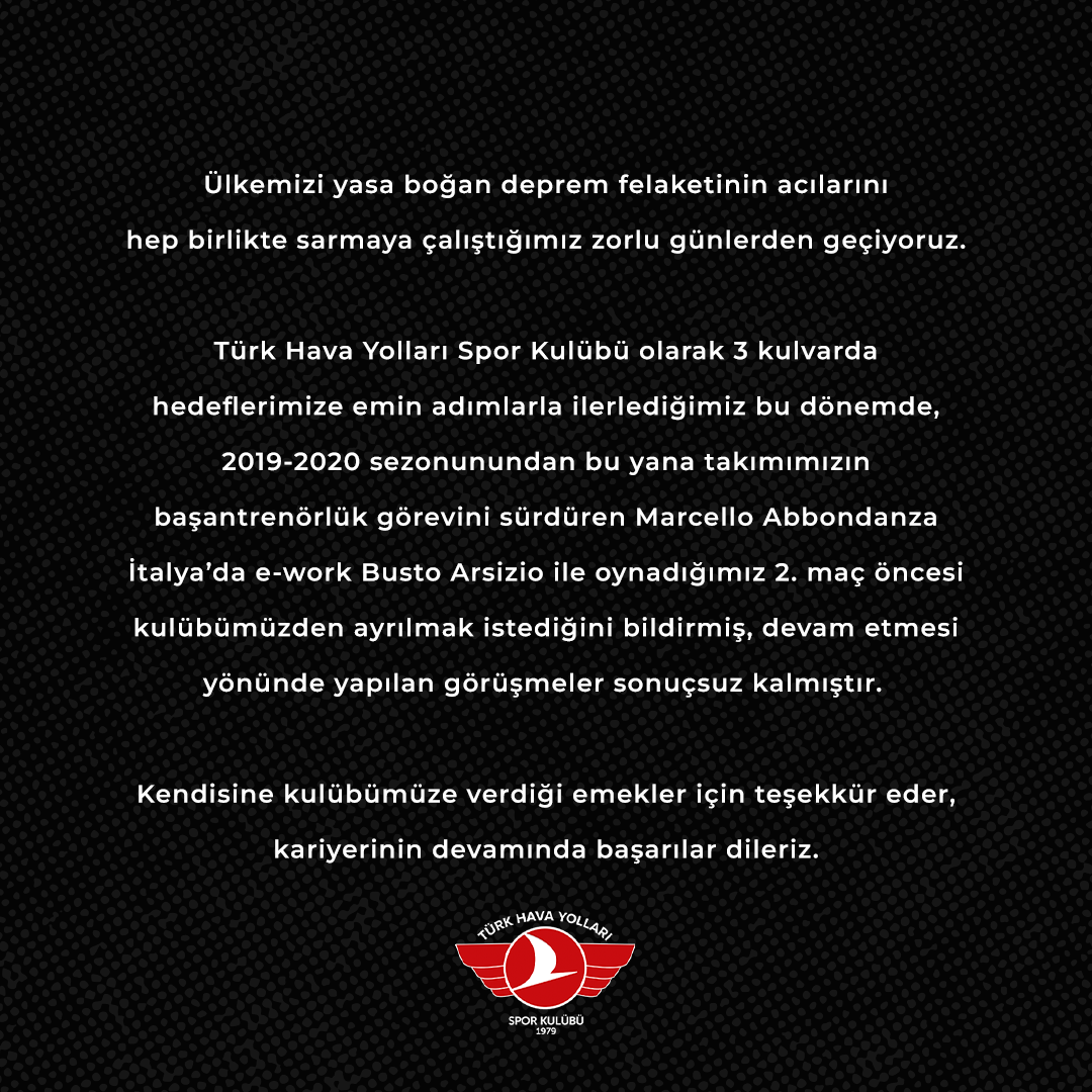 Türk Hava Yolları Spor Kulübü olarak 3 kulvarda hedeflerimize emin adımlarla ilerlediğimiz bu dönemde, 2019-2020 sezonunundan bu yana takımımızın başantrenörlük görevini sürdüren Marcello Abbondanza İtalya’da e-work Busto Arsizio ile oynadığımız 2. maç öncesi kulübümüzden ayrılmak istediğini bildirmiş, devam etmesi yönünde yapılan görüşmeler sonuçsuz kalmıştır.
