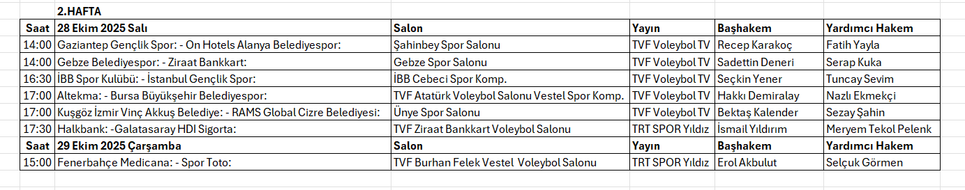 TVF Resmi internet sitesindeki maç programında açıklanan programa göre ikinci hafta maçlarını yönetecek hakemler ve canlı yayın programı şöyle: