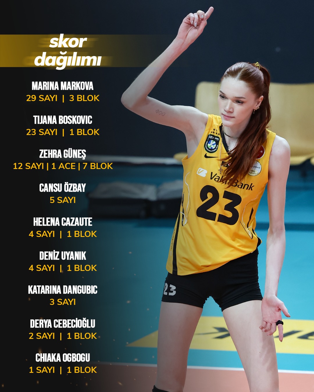 VAKIFBANK: Deniz Uyanık 4, Cansu Özbay 5, Marina Markova 29, Zehra Güneş 12, Tijana Boskovic 23, Katarina Dangubic 3, Ayça Aykaç Altıntaş (L), Helena Cazaute 4, Derya Cebecioğlu 2, Chiaka Ogbogu 1